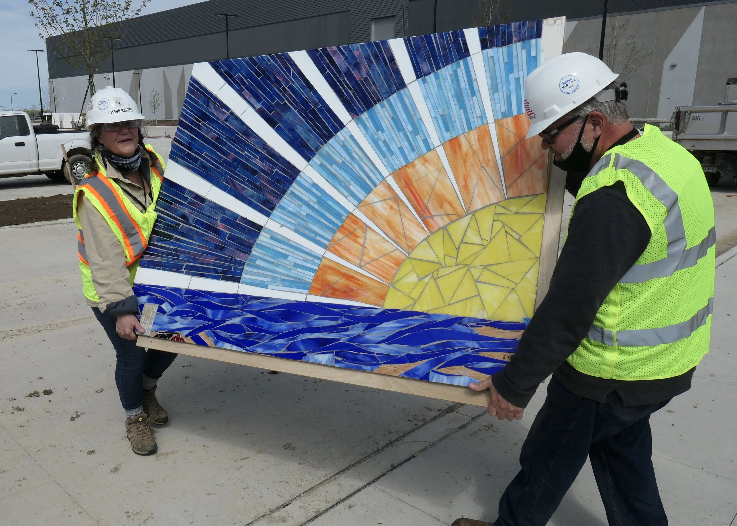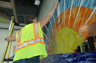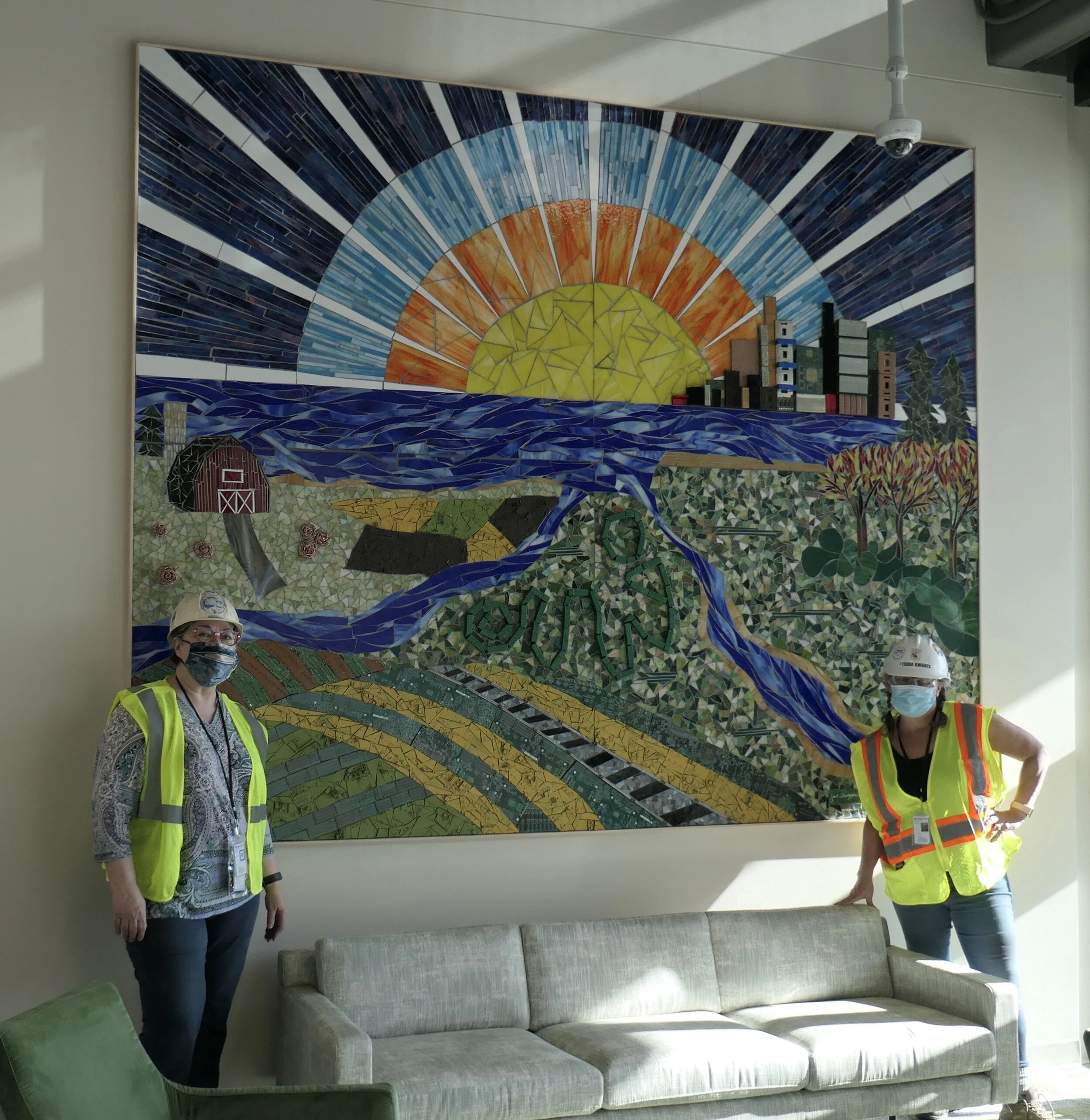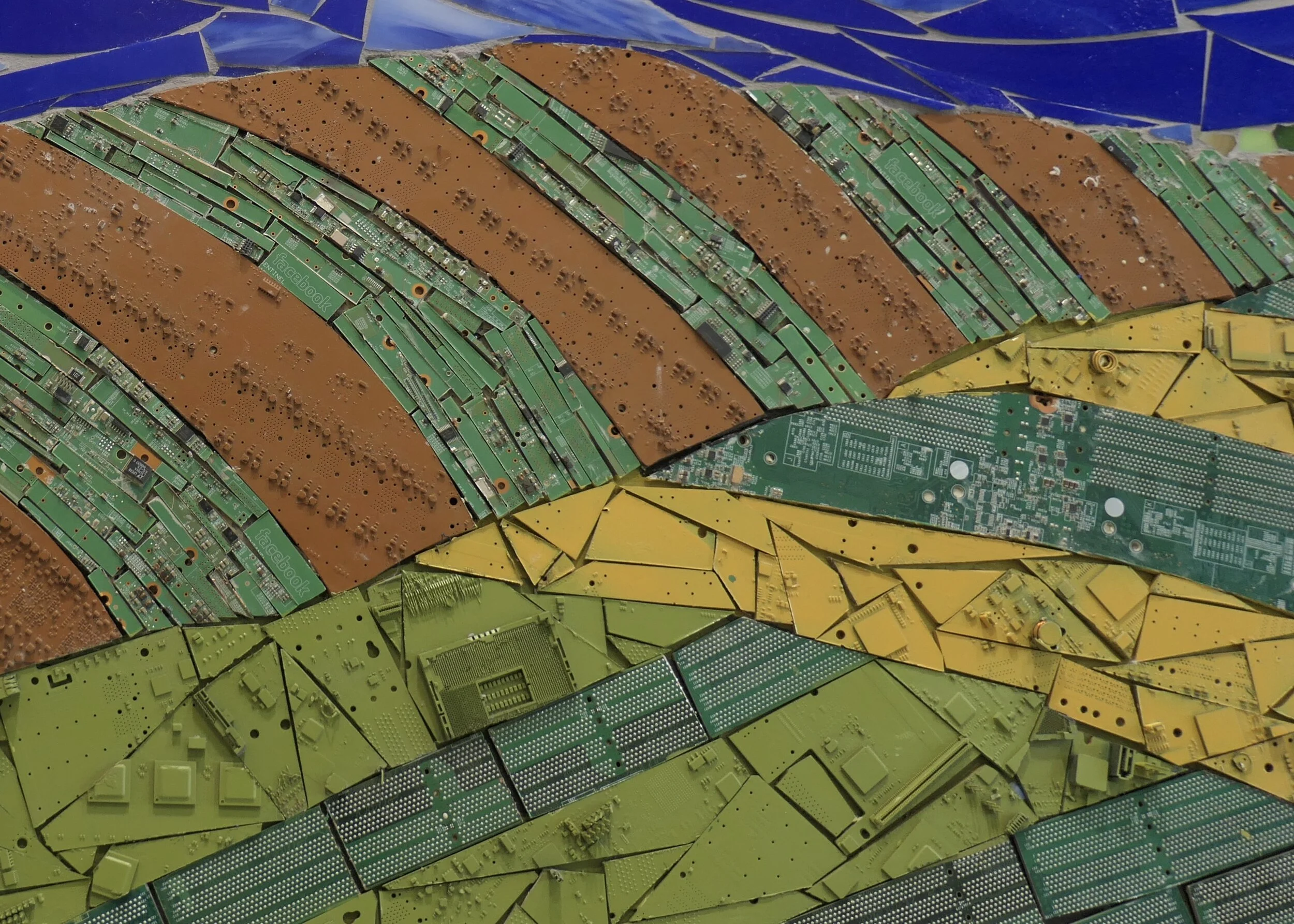 A 8 ft x10 ft commissioned mural for a second Facebook Data Center in New Albany, Ohio lobby was created with recycled computer motherboards, misc other computer parts and glass. This exciting mixed media piece is made up of 4 panels with a visual of things found in Ohio.